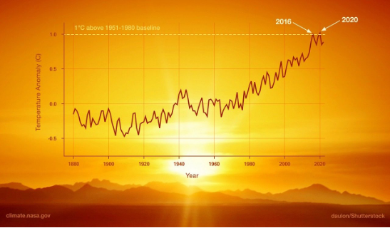 Biểu đồ minh họa sự thay đổi nhiệt độ bề mặt toàn cầu so với nhiệt độ trung bình giai đoạn 1951-1980, trong đó năm 2020 có nhiệt độ cao tương đương với năm 2016, là năm nóng nhất từng được ghi nhận (Nguồn: NASA).